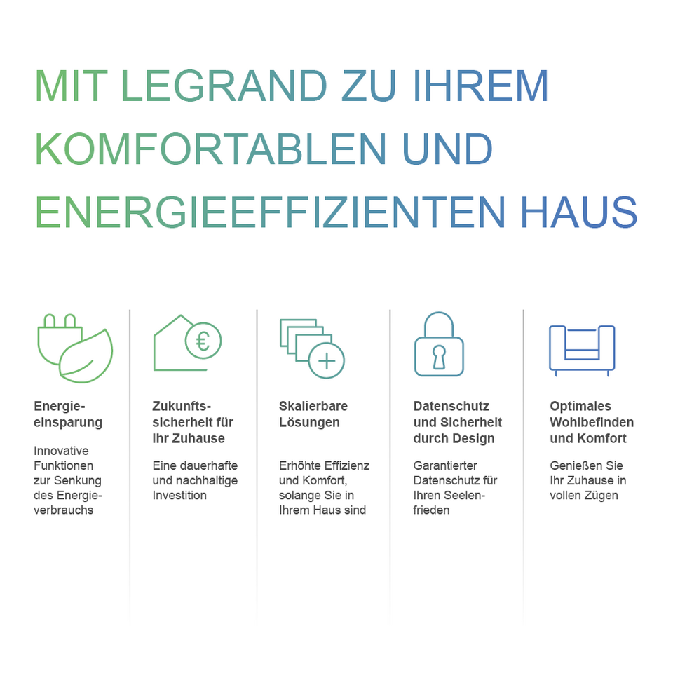 Das Bewusstsein für ökologische und „grüne“ Themen ist ein Megatrend, den Legrand in seine Zukunftsstrategie fest integriert hat. Die Erhaltung der Umwelt, die Nachhaltigkeit natürlicher Ressourcen und die Verringerung der Auswirkungen menschlicher Aktivitäten auf den Planeten entsprechen den Erwartungen von immer mehr umweltbewussten Verbrauchern. Sie haben den Wunsch mehr Verantwortung für die Umwelt zu übernehmen – und das auch in ihrem Zuhause. Gleichzeitig wird durch Umfragen belegt, dass ein wachsendes Bedürfnis nach Komfort und Sicherheit rund um das Thema Haus herrscht, sodass Produkte aus dem Bereich der Hausautomation sowie vernetzte Lösungen immer interessanter für den Endkunden werden. Diesen Erkenntnissen folgt Legrand mit seiner neuen Strategie im Bereich Haus- und Wohnbau. Die Steigerung des Komforts und der Sicherheit bei gleichzeitiger Minimierung des Energieverbrauchs und damit der Reduzierung des ökologischen Fußabdrucks führt zum „nachhaltigen Wohlbefinden“ der Kunden. Dieses innovative Konzept mit einer starken Betonung des Wohlbefindens verschafft Legrand ein Alleinstellungsmerkmal und damit eine einzigartige Positionierung am Markt.